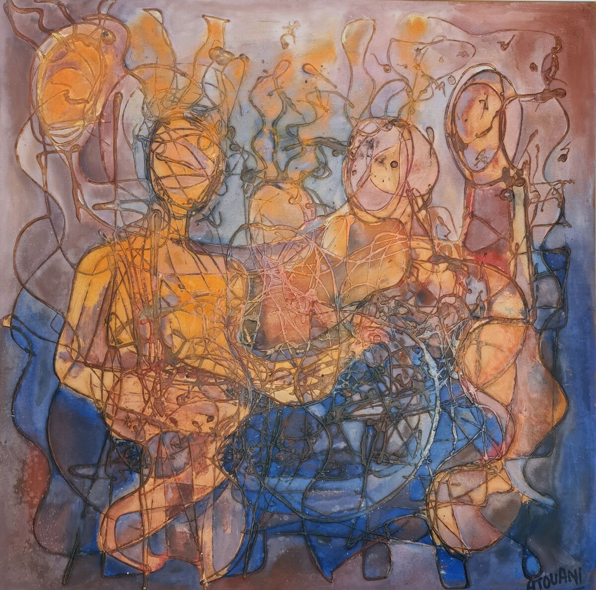 PEINTURE ABSTRAITE EVOQUANT DES CORPS FORMANT UN JARDIN FLEURI.UNE IDEE SYMBOLISANT L'ABOLITION DES FRONTIERES GRACE A DES CORPS LIBERES. HUILE A LA SPATULE.
