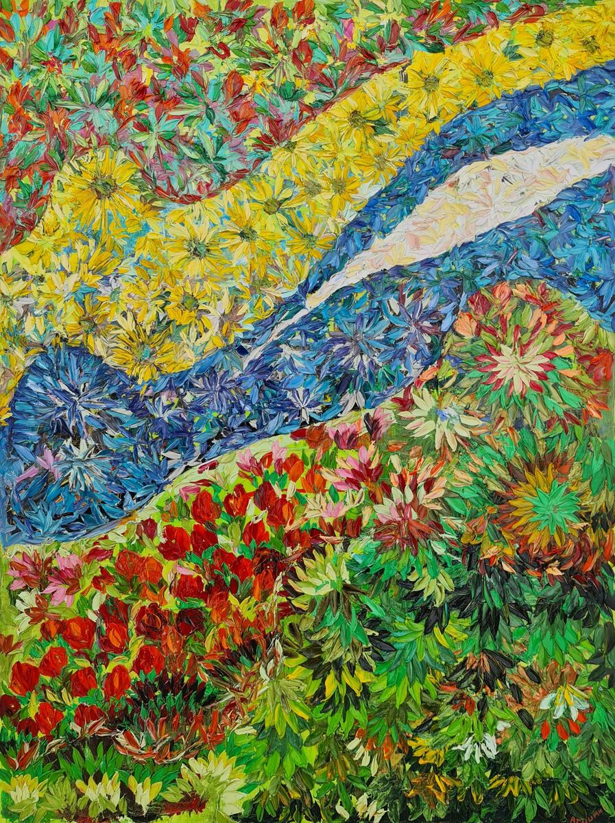 PEINTURE ABSTRAITE EVOQUANT DES CORPS FORMANT UN JARDIN FLEURI.UNE IDEE SYMBOLISANT L'ABOLITION DES FRONTIERES GRACE A DES CORPS LIBERES. HUILE A LA SPATULE.