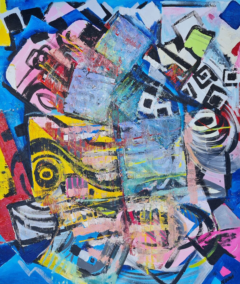 ABSTRAIT INSPIRE DES TABLOIDS ANGLAIS D'UNE CERTAINE PERIODE TABLOID 1 FAIT PARTIE D'UNE SERIE DE QUATRES OEUVRES TECHNIQUES MIXTES ACRYLIQUE